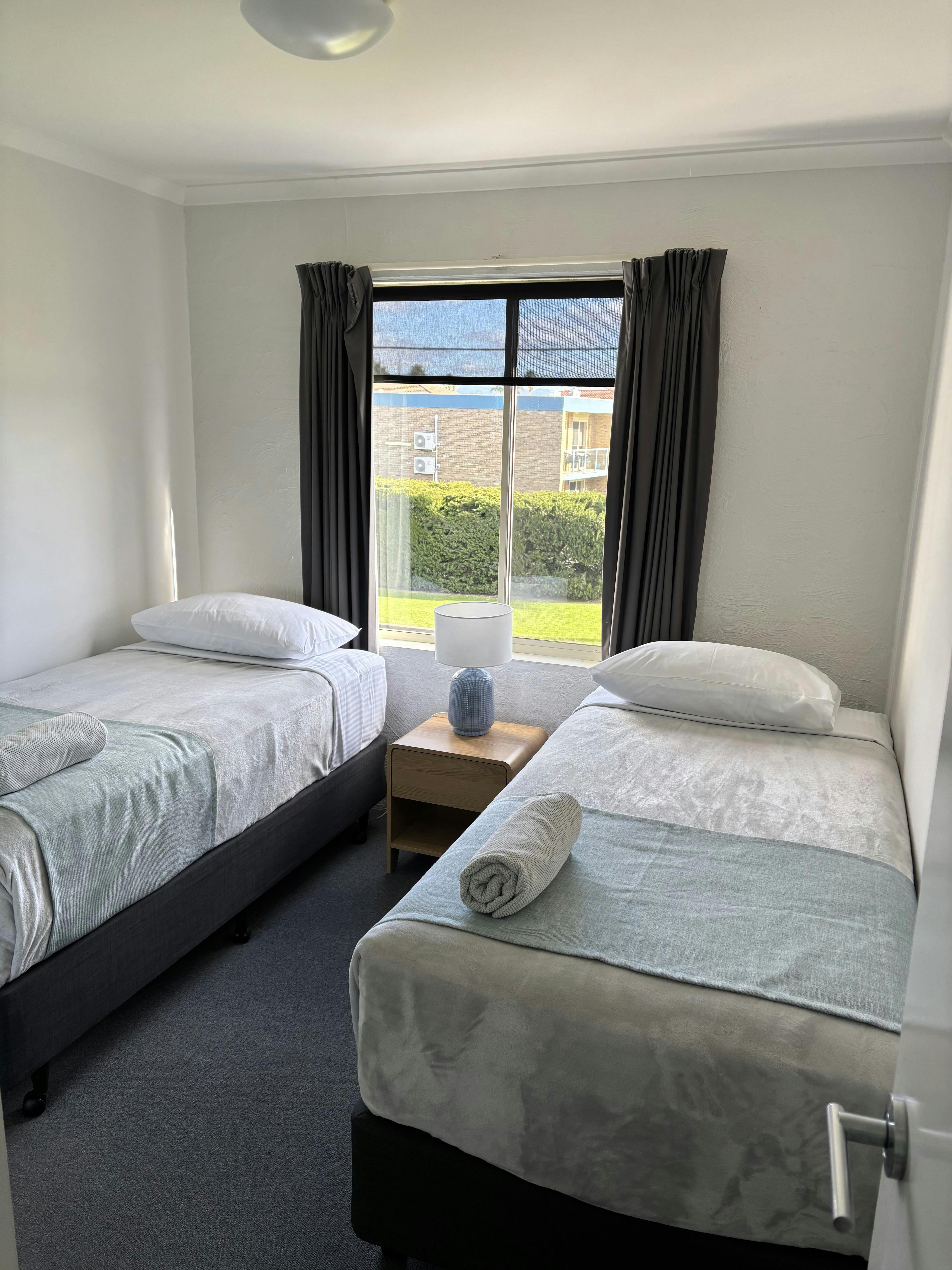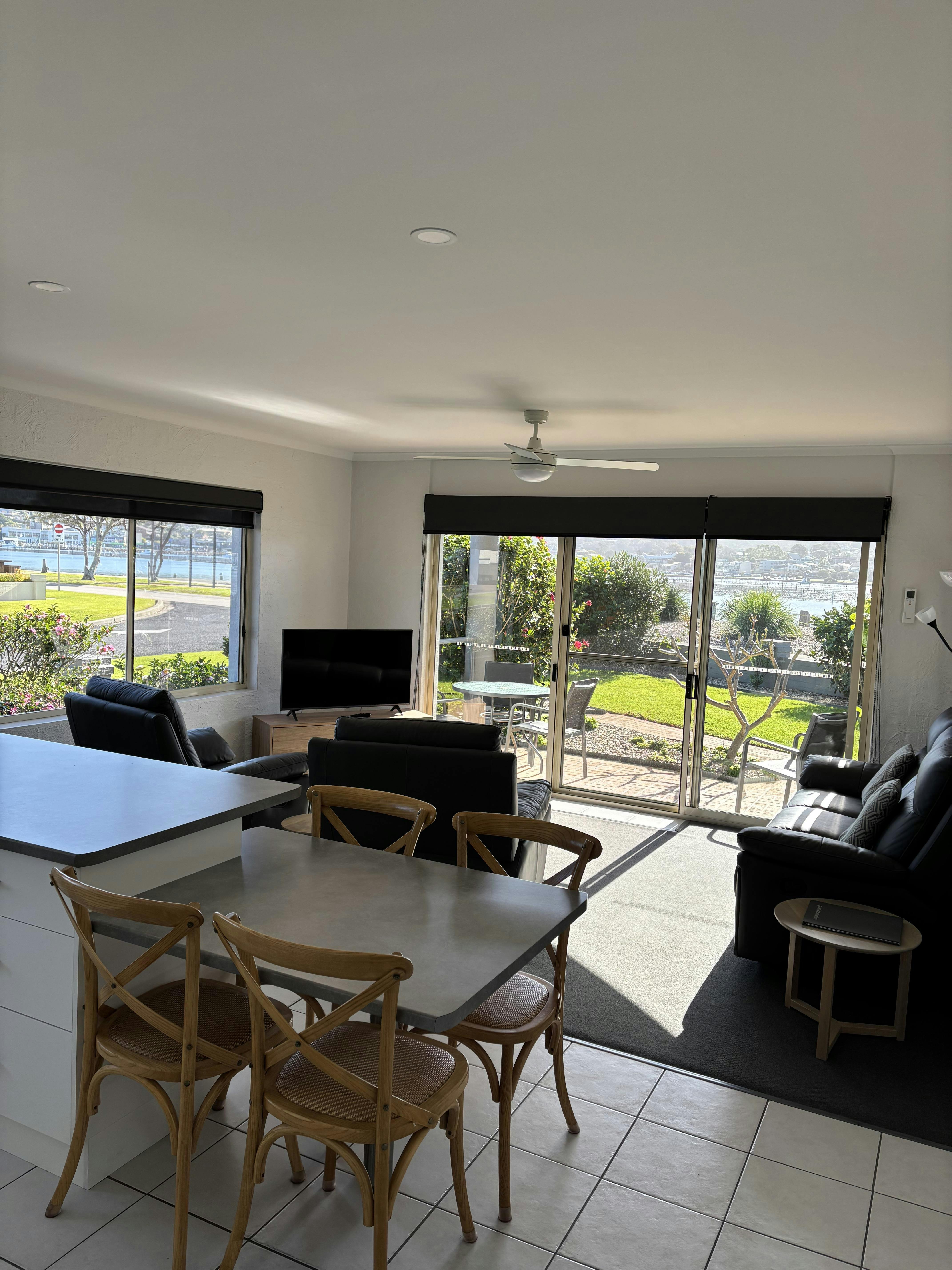 Escape to the tranquil shores of Merimbula Lake with a stay at this inviting downstairs 2BR apartment! This apartment offers a perfect blend of comfort and convenience. Enjoy modern amenities like air conditioning, a fully equipped kitchen, and a private patio, all designed to make your stay as relaxing as possible. With easy access to the lake and nearby ocean, you'll have endless opportunities for water activities and scenic views. Perfect for families, this apartment is suitable for children and infants, ensuring a memorable vacation for everyone. Step inside this inviting downstairs apartment and discover a thoughtfully designed space perfect for a relaxing getaway. The apartment features two well-appointed bedrooms. The main bedroom offers a comfortable queen-size bed, ensuring a restful night's sleep, and an ensuite bathroom for added privacy and convenience. The second bedroom is furnished with single beds, ideal for children or additional guests. Both bedrooms are designed to provide a tranquil retreat after a day of exploring Merimbula. The living and dining area is a shared space, creating a welcoming atmosphere for socializing and enjoying meals together. This area is designed to be comfortable and functional. The apartment also includes two bathrooms, a well-equipped kitchen complete with a dishwasher, refrigerator, stove, microwave, and all the necessary cookware and dishes. Enjoy meals at the dining table or step outside onto the private patio, where you can relax and soak up the tranquil surroundings. The apartment is equipped with modern amenities, including air conditioning, heating, a washer and dryer, and wireless internet, ensuring a comfortable and convenient stay.